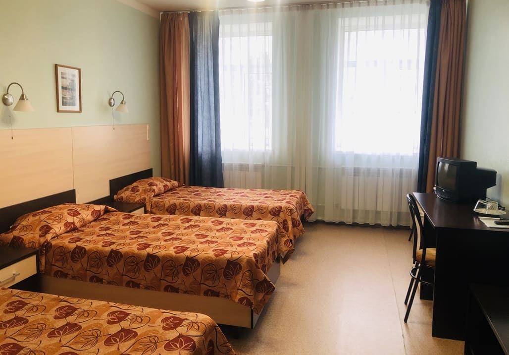 В номере: вешалка, зеркало, кровати односпальные: 3, прикроватные тумбочки, стол, стулья, шкаф, телевизор