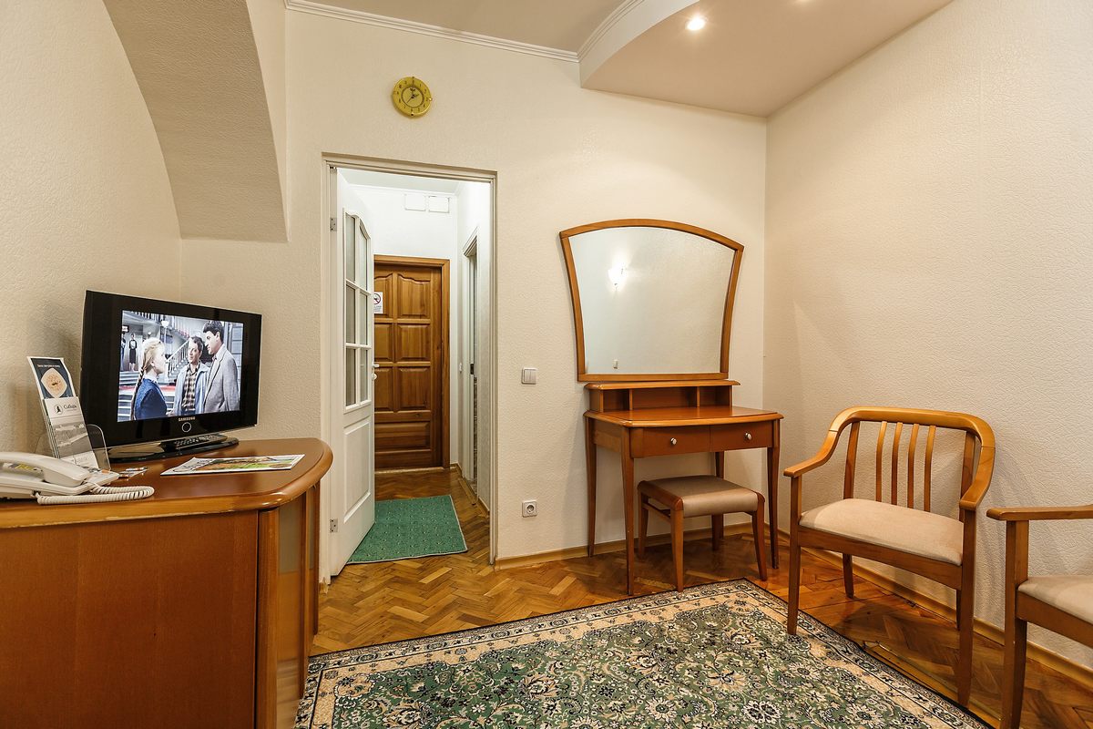 В номере: две односпальные кровати или рдна двуспальная, прикроватные тумбочки, шкаф, столик журнальный, туалетный столик, телевизор, телефон, чайник, холодильник, сушилка для белья